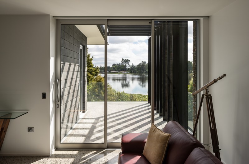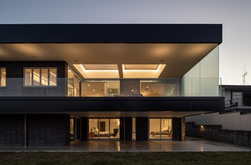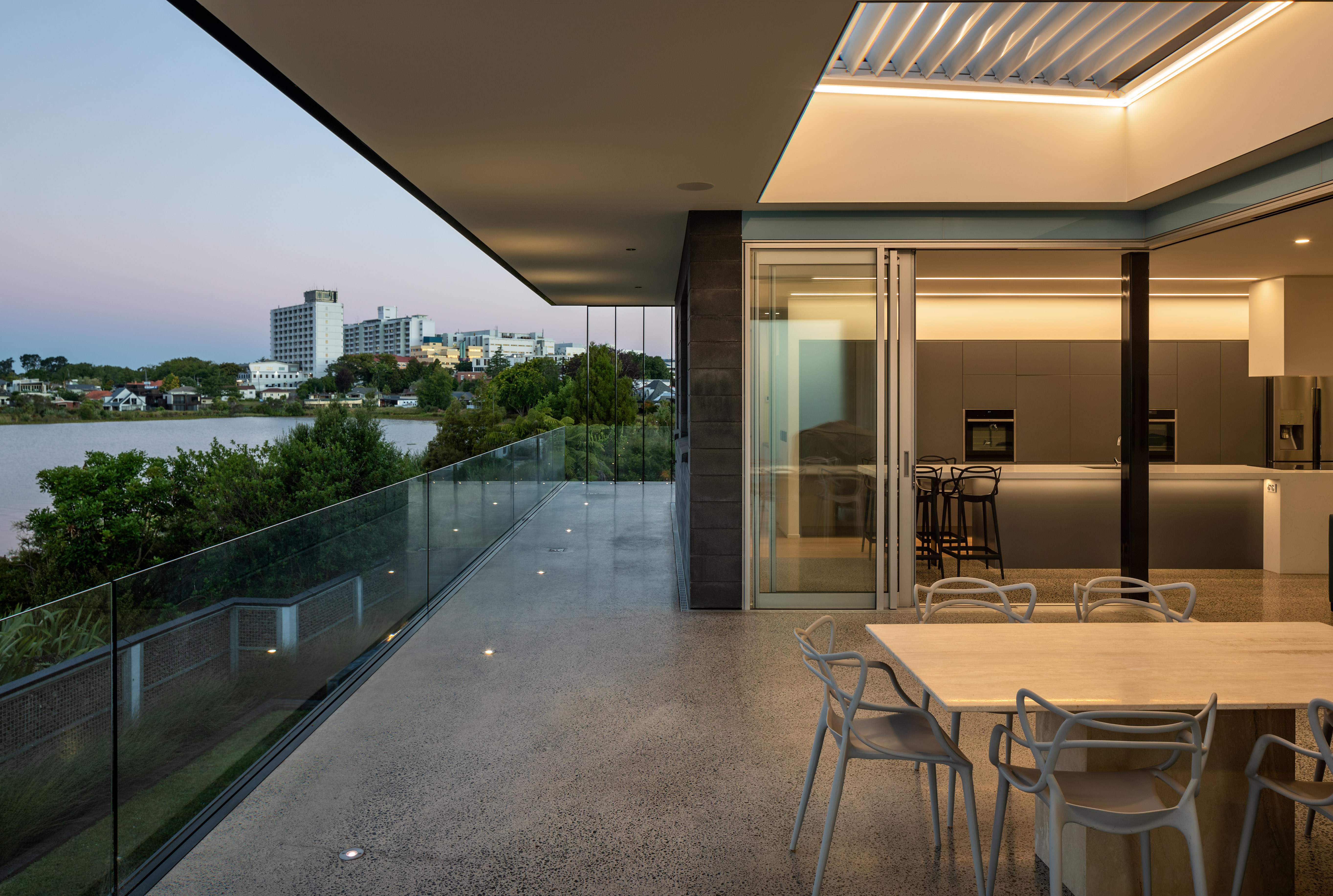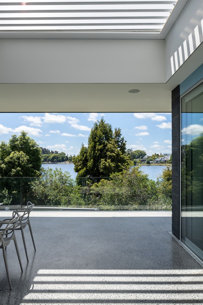 The panoramic views are maximised by the location of the New House recessed into the earth while projecting towards the Lake. A layering of spaces, with large expanses of sliding glass walls that dematerialise boundaries, connecting multiple spaces. They are open and transparent but subtly private. The Design controls and tempers the views like a classic camera or telescope, framed by the black steel fins, polished concrete, honed concrete block and cantilevered canopy.