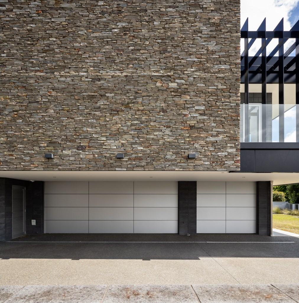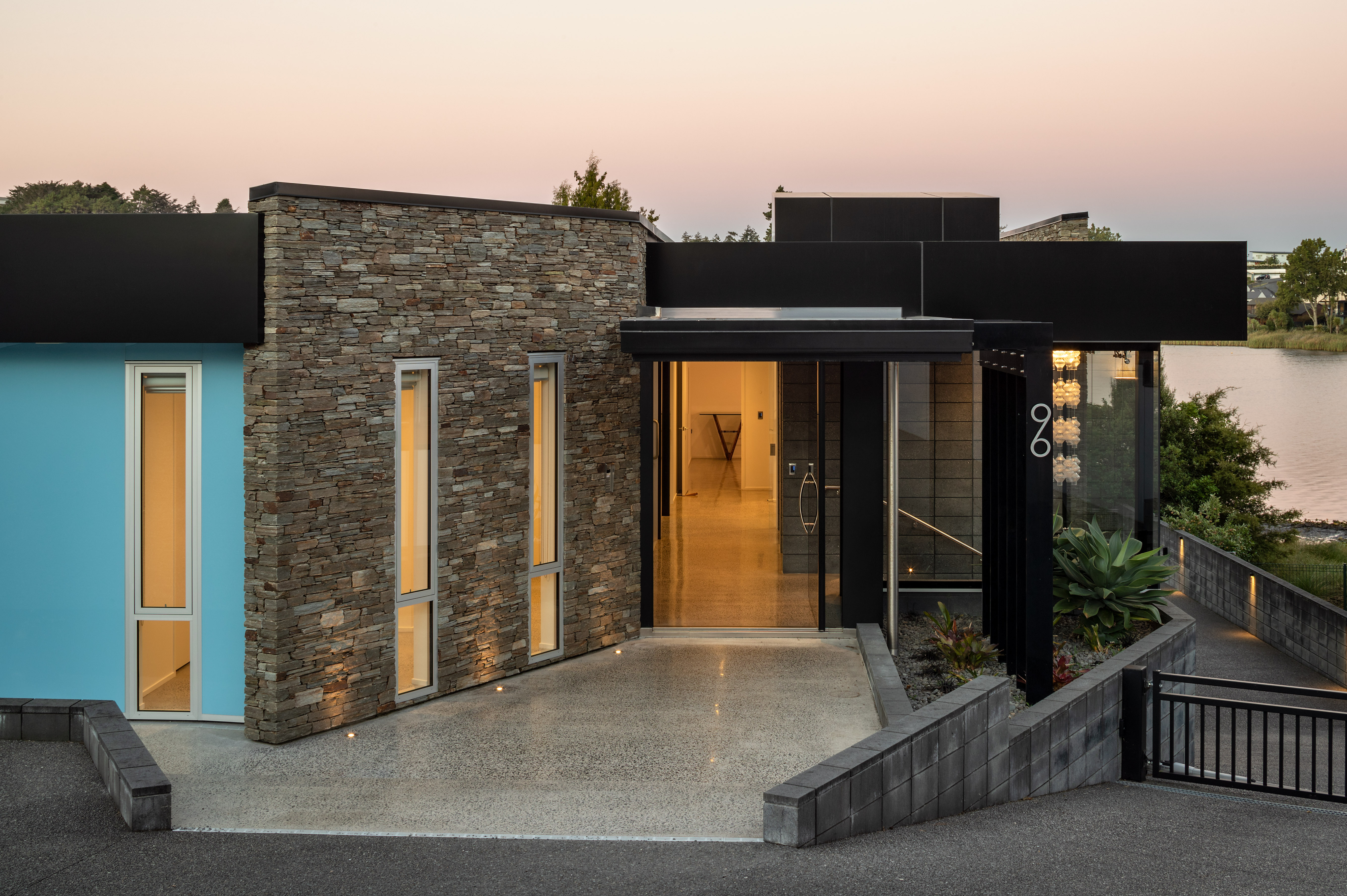 Our Design approach was to create a Sustainable building intended to last, to allow intergenerational succession and adaptability. Cantilevers and flying eaves provide protection for the building and claddings. The exterior of the building is schist, concrete block, aluminium and glass designed for minimal maintenance and endurance. North facing cantilevered roof and decks provide passive solar control. Stone walls, concrete block and concrete floors provide thermal mass. Large sliding doors provide natural cross ventilation and protection. The automated louvres both sides of the House are orientated to control sunlight to penetrate deeper into the spaces when required. Small windows and solid construction protect against prevailing winds and the harsh West sunlight.