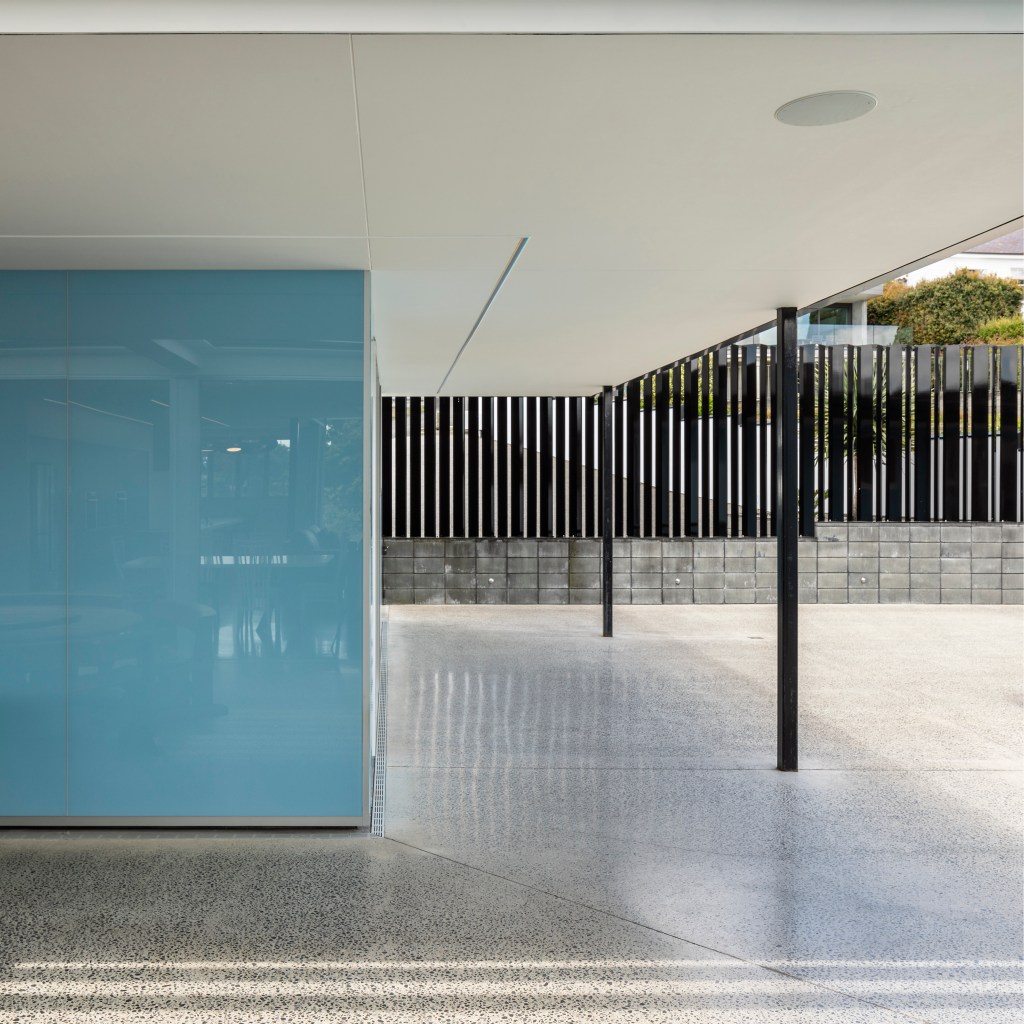 The blue glass wall cladding makes reference to the sky and water being reflective, cool, calming and shimmering. With secret fixed glass wall cladding it was designed to be a sustainable enduring solution, low maintenance and sophisticated.
