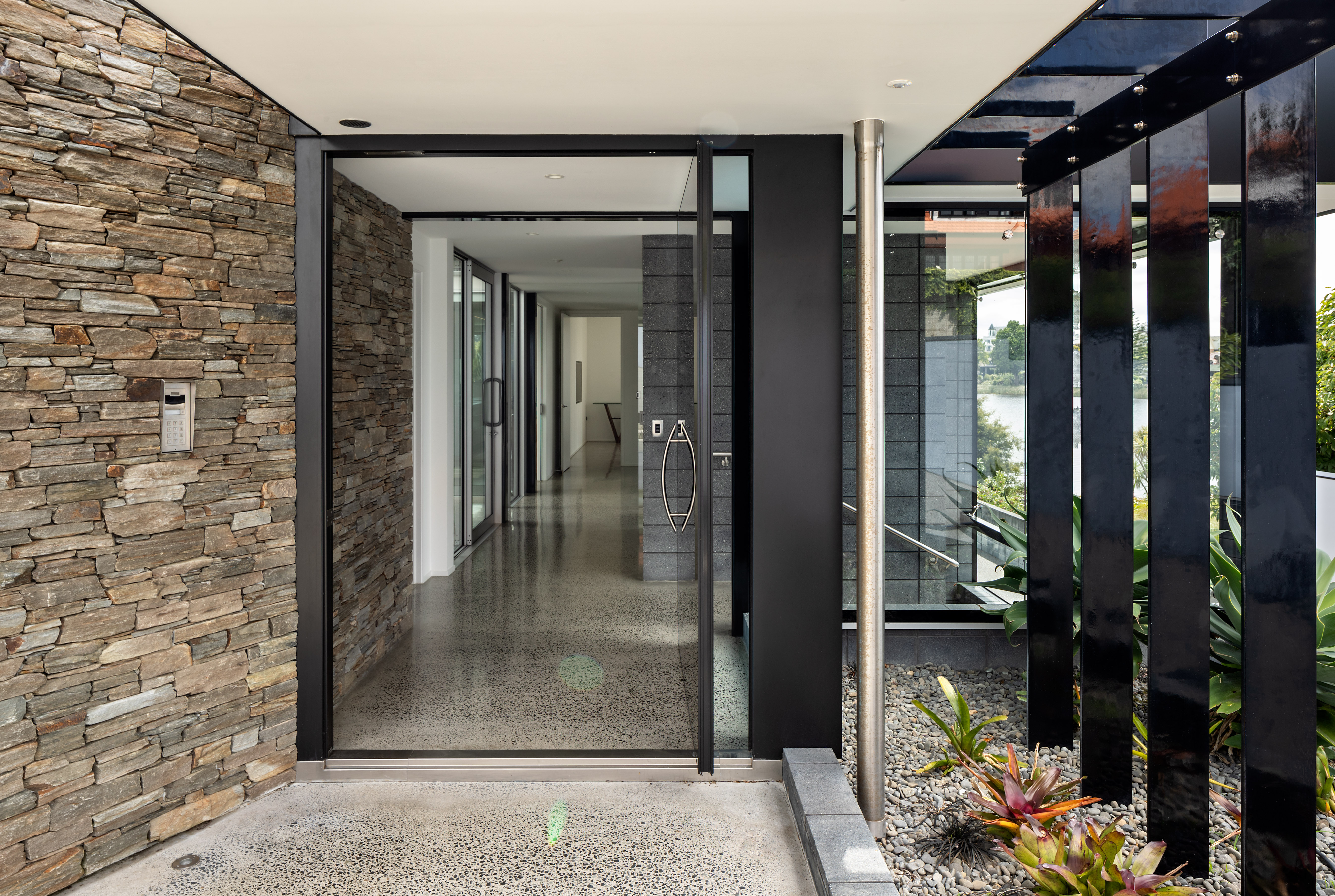 The Client wanted to have a low maintenance, durable set of materials which included the integration of his steel craft into the House so provided all the exposed structural steel columns identified in the House as 2 pot lacquer gloss finish columns and skeletal steel frame elements at the Entry, Lake Deck and West Courtyard. The Client required robust materials to handle the intergenerational family and dogs.