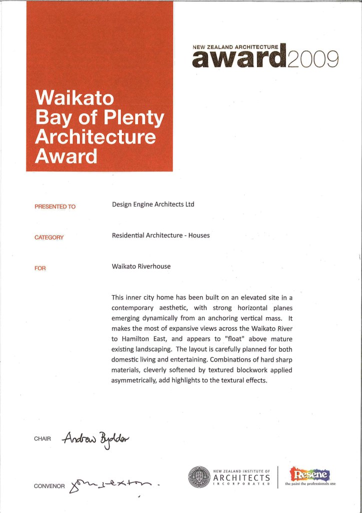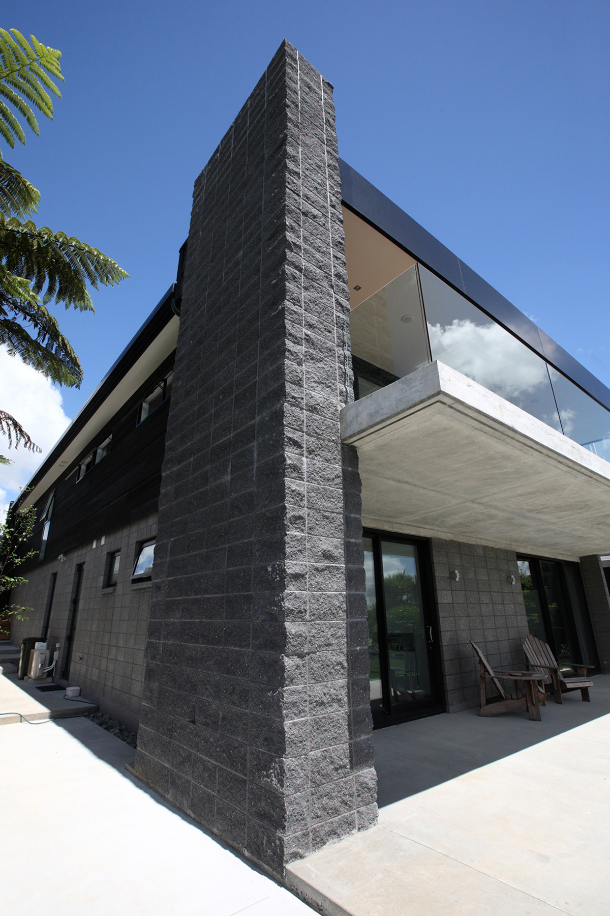 Waikato Riverhouse was inspired by the Mighty Waikato River, its movement and flow revealing layers of silt, sand and gravel which are reflected in the variety of materials and the expressive form of the House. Blacksand honed concrete block creates a robust and durable base. Custom designed band sawn, black stained cedar cladding creates a horizontal layering effect above the block. The striated cedar cladding is reminiscent of a boulder that has been scoured by the river bed.