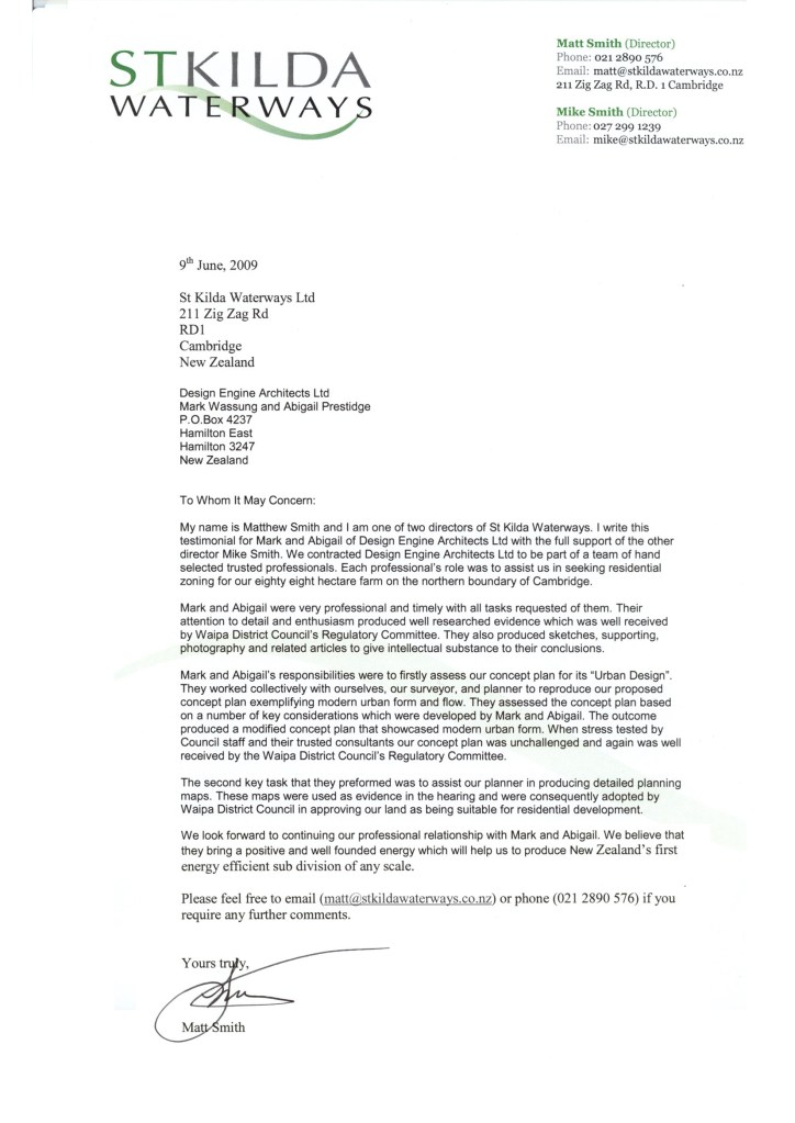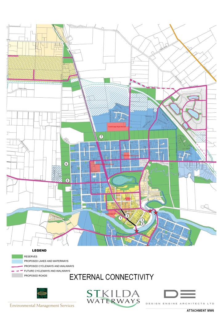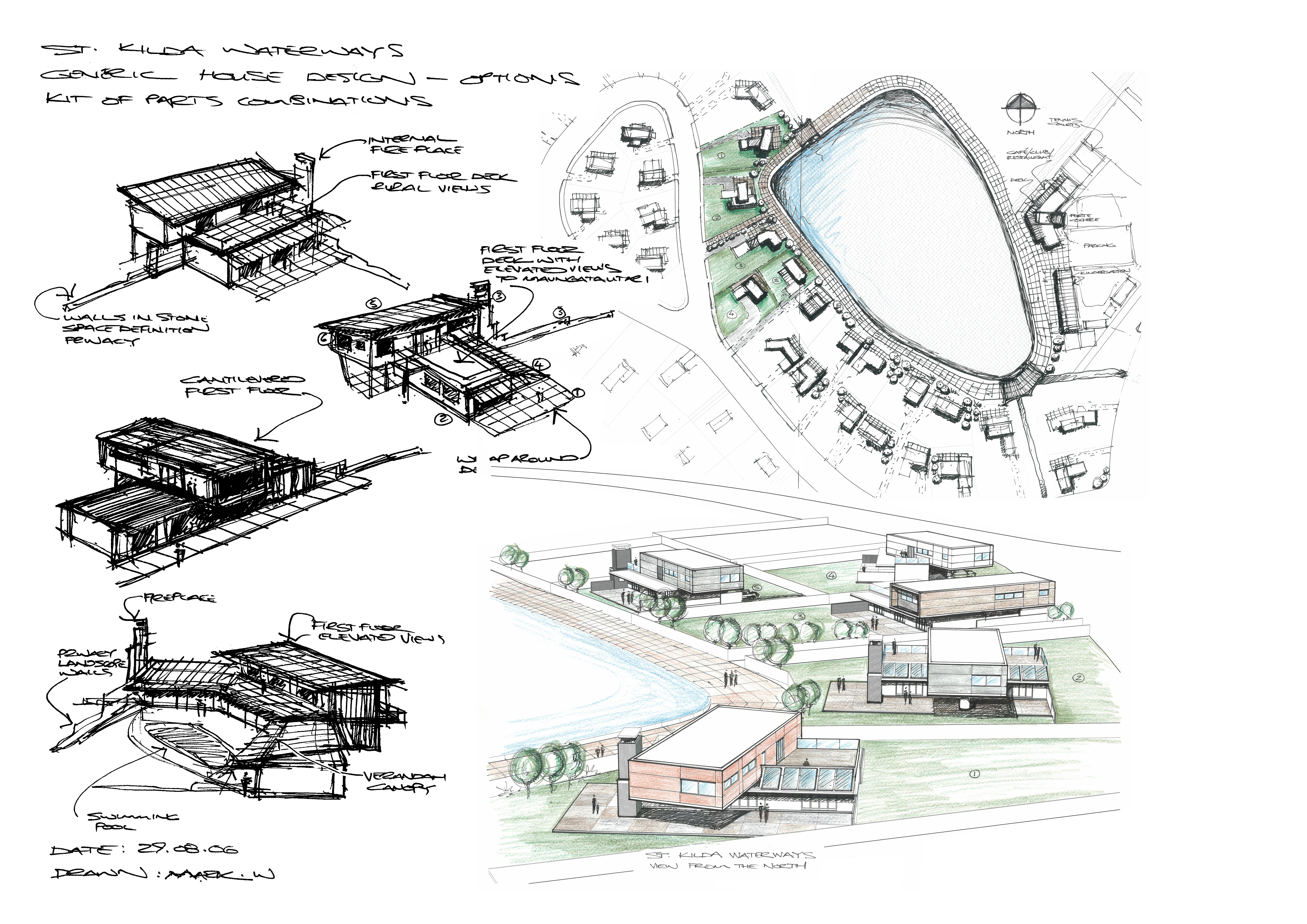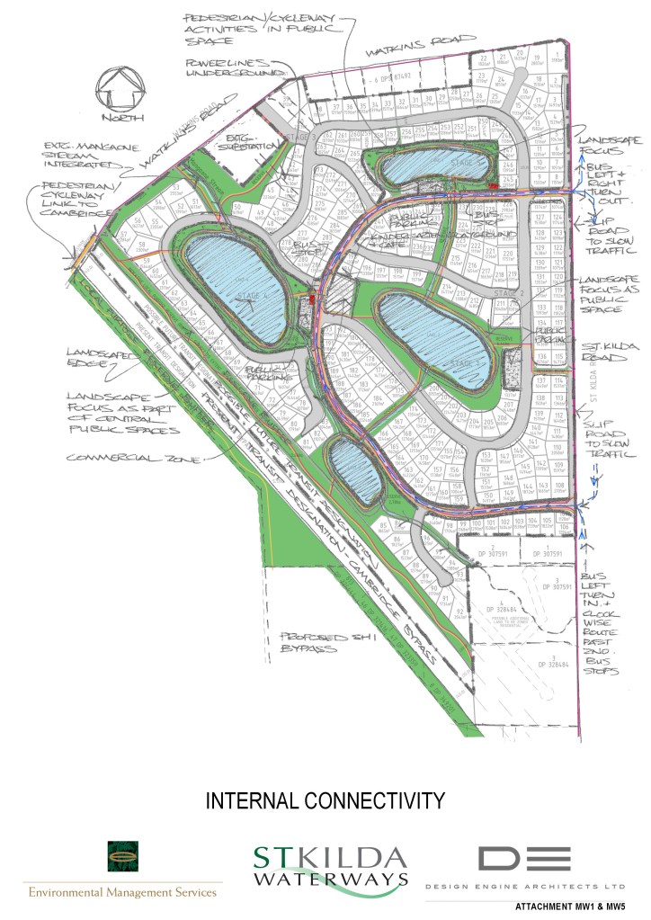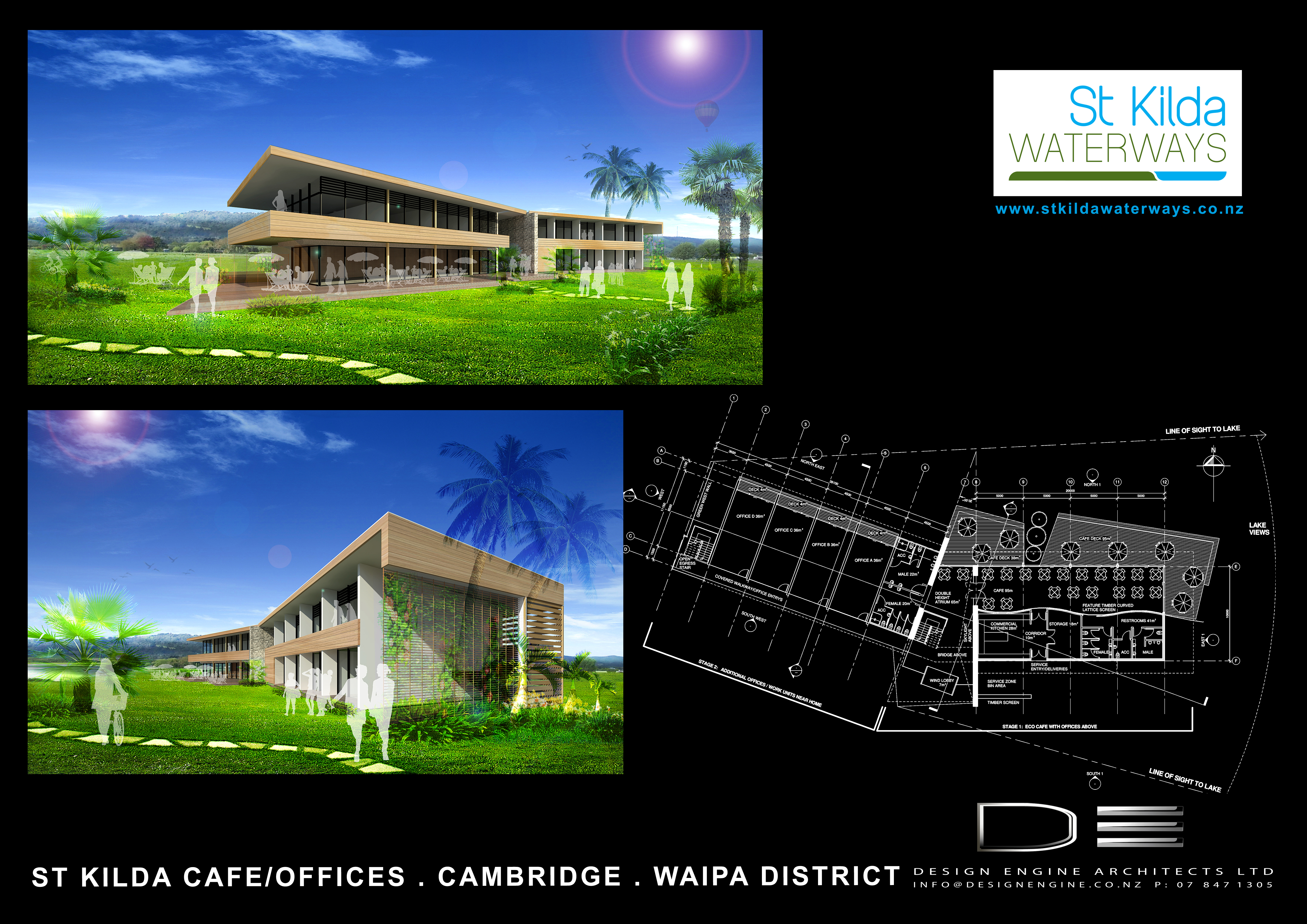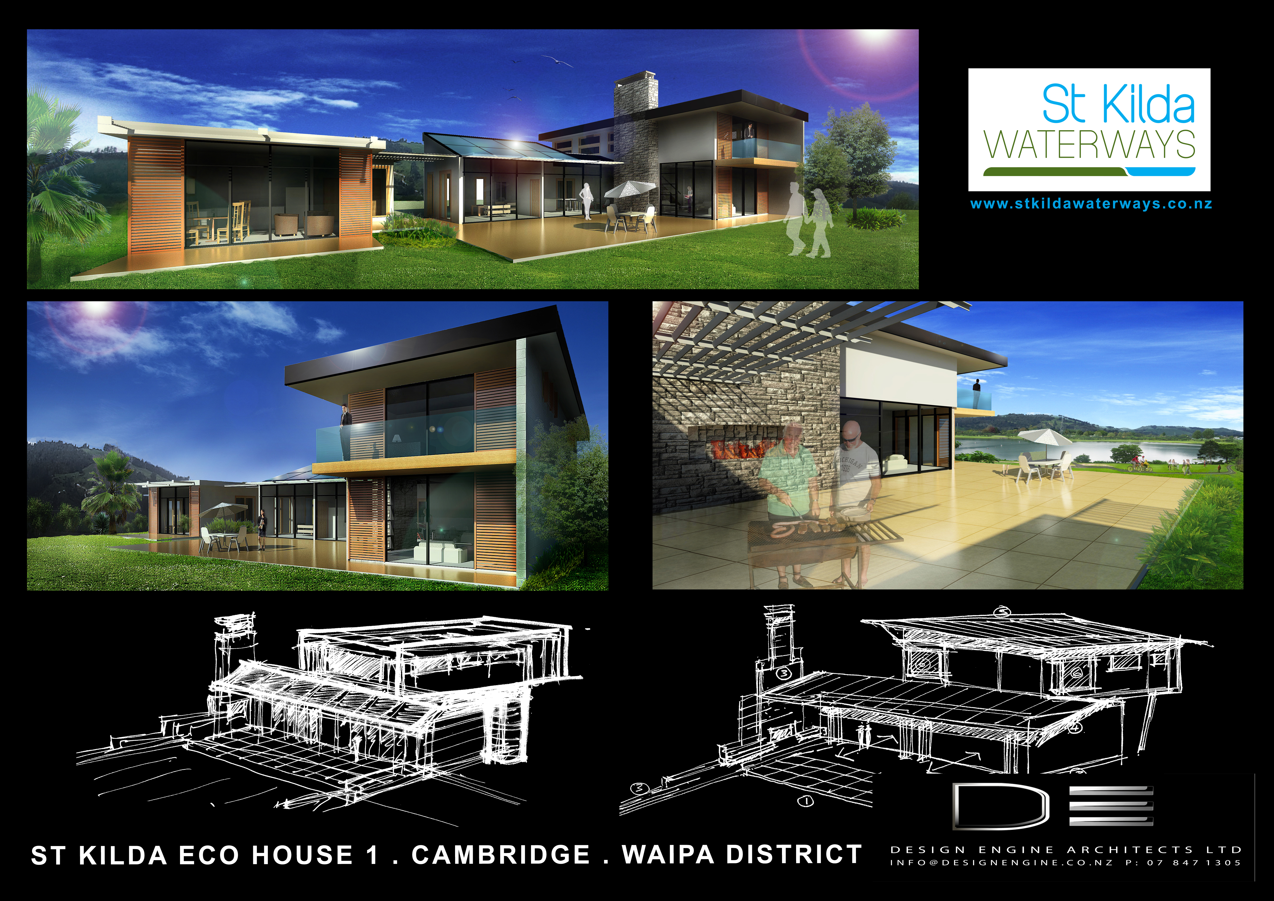St. Kilda Waterways is an Eco-Village designed on an existing Dairy Farm site in Cambridge. It is an 87 hectare, 285 House Eco-Village Development with average lot sizes of 1200m2 – 1500m2 and larger homes of minimum 200m2. St. Kilda was designed to be the first Sustainable Design concept of its scale and nature to be built in New Zealand. Its unique features included 4 Lakes which have a dual purpose of being aesthetically pleasing and providing storm water control/storage. A Central Park linking the 2 largest Lakes, 9km of safe, secure dedicated walkways and cycleways, an Enviroschool Kindergarten and Cafe with live video feed to the Maungatautari Ecological Island Reserve, including the Kiwi Programme. Design Engine Architects were the Urban Designers and Architects for this pioneering project that established a new benchmark for living in New Zealand. The development draws its inspiration from International Eco-Village examples, the Waitakere City Council Sustainable Design Guidelines and the Environment Waikato Sustainable Design Framework. The Clients Matt and Mike Smith of Grantchester Farms Ltd are a well established Cambridge Family that are passionate and dedicated to their Home, Context and Future of the Development. Mark Wassung and Abigail Wassung were an integral part of Plan Change 58 introducing the interweaving of Architecture, Urban planning and Landscape Architecture into one cohesive vision that enabled this subdivision to be approved and successfully completed.